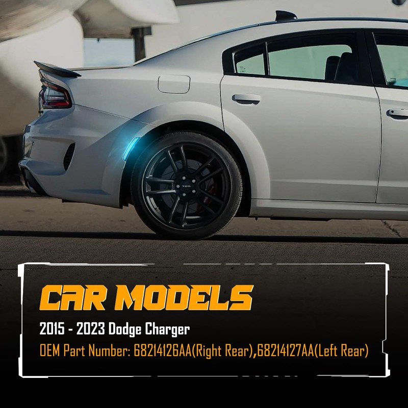 - 🚗【COMPATIBILITY】The Rear Fender LED Side Marker Lights As Dodge Charger Accessories Compatible With 2015 2016 2017 2018 2019 2020 2021 2022 2023 Dodge Charger;Rear Bumper Side Marker Lights Kits. OEM Part Number: 68214404AA (Right Front)、68214126AA(Right Rear)、68214405AA (Left Front)、68214127AA(Left Rear).