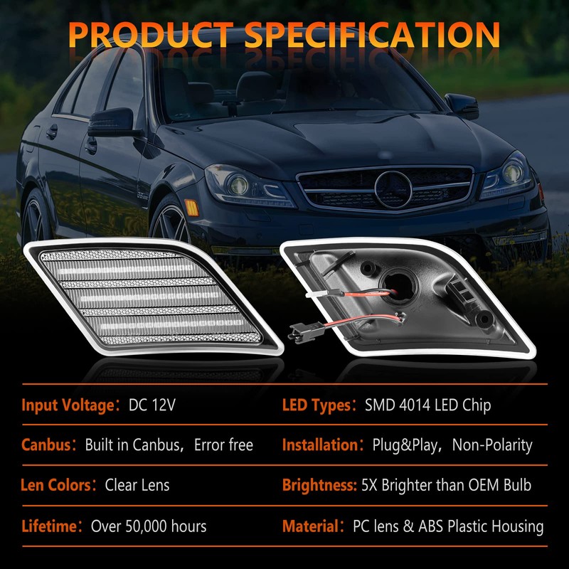 - 【COMPATIBILITY】Front Side Marker LED Fender Lights For 2008 2009 2010 2011 Mercedes Benz W204 C250 C300 C350 and 2008 2009 2010 2011 2012 2013 Mercedes Benz W204 C63 AMG and 2005 2006 2007 Mercedes Benz W204 SL65 AMG.