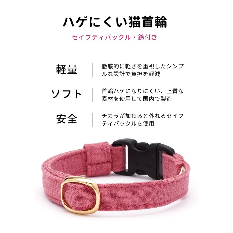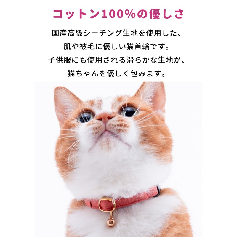 This cat collar is gentle on the skin and fur using high quality sheeting fabric made in Nishiaki City, Hyogo Prefecture. The smooth fabric used in children's clothes will gently wrap your cat. Available in a wide variety of colors, so you can enjoy color coordination with clothes, fur colors, and interior decorations. Recommended for multiple people and cats who enjoy dressing up.