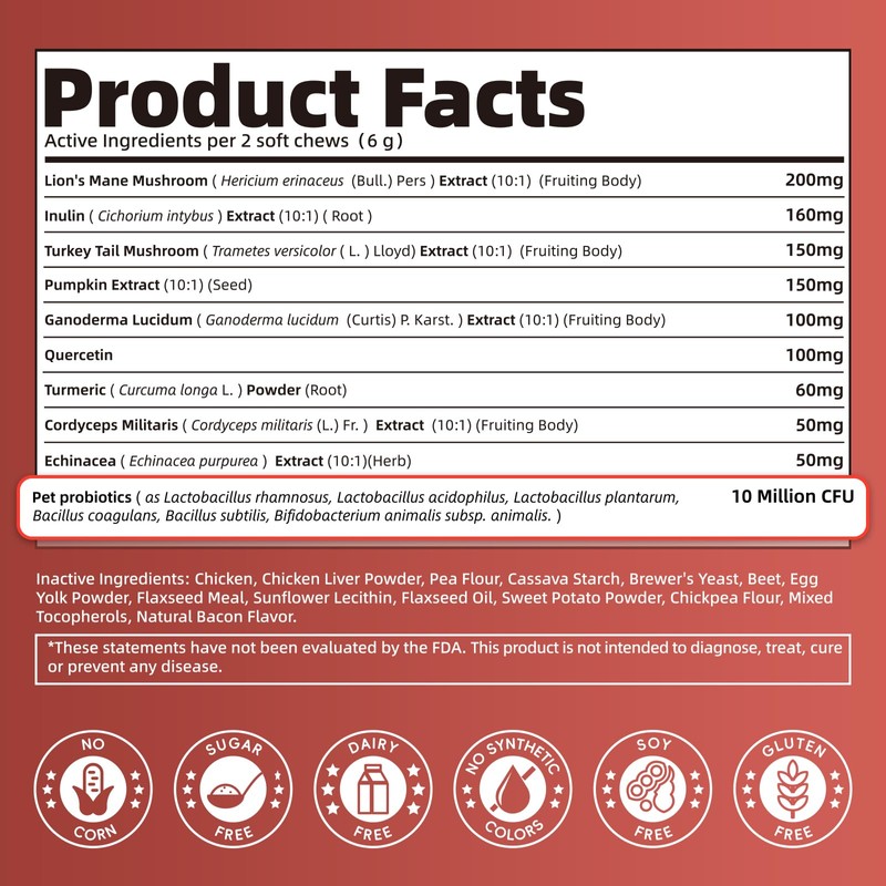 - Nature's Immune Trifecta: Boost your dog's overall immune health with our probiotics supplement featuring ganoderma lucidum, turkey tail mushroom, and echinacea for overall immune support through multiple pathways