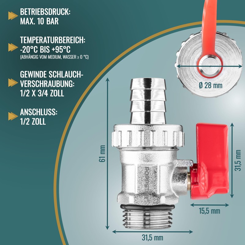 • Anschlussgröße: 1/2 Zoll, Schlauchverschraubung 1/2" x 3/4" (zum Anschluss eines 1/2" Schlauches)