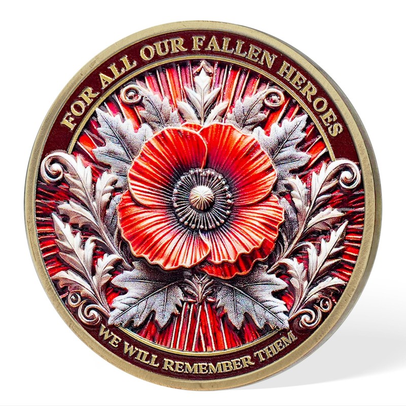 - Honoring Fallen Heroes: This memorial coin with a poppy flower and cross gravestone design pays tribute to the heroes who sacrificed their lives in war. It honors those who gave their lives for the country and peace, reminding us to remember history and the sacrifices made by these heroes. The coin expresses eternal remembrance for the fallen, not only to honor the deceased but also to convey wishes for future peace. It offers deep respect for those who laid down their lives for freedom and peace