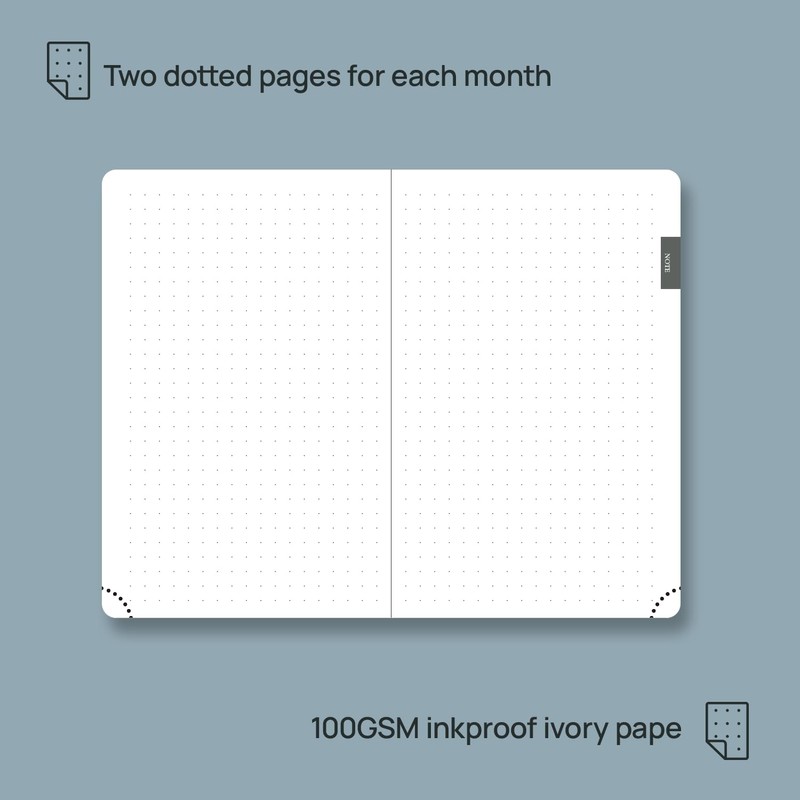 - [EXTRA FUNCTIONAL PAGE] Dotted note for each month provide enough space to collect your ideas. Year Overview + Travel Planner + Password Page + Contact Page + Extra Notes Page are also included.