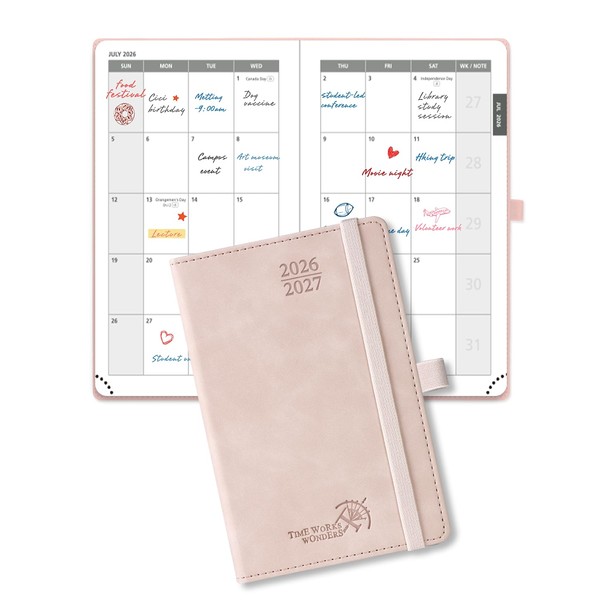 POPRUN 2 Year Month to View Pocket Diary 2026-2027 A6 Monthly Planner (24 Months: Jan'26 - Dec'27) 100 gsm Paper, 4 Pages per Month, 144 Pages, PU Leather Hardback (Soft Pink)