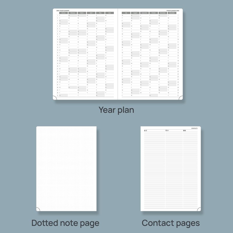 - EXTRA PAGES - This 2026 daily planner also contains "2026-2027 Year Planner" Page + "2026 Holiday & Calendar" Page + 2 Contact Pages +1 Password Page + 8 Dotted Notes Pages for jotting down your ideas, thoughts or any other happy things in detail.