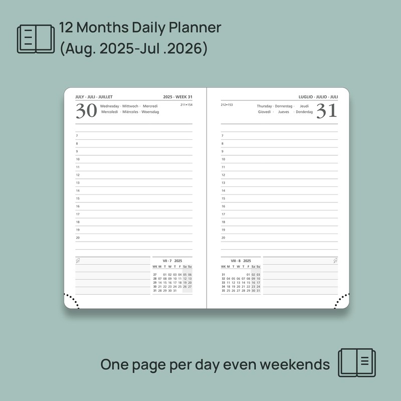 - [EXTRA FUNCTION] Monthly overview with space for notes on the side. 2025 & 2026 Year Overview + Expenses Page + Contact Page + Extra Dotted Notes Page are also included. Extendable pocket on the back for small items.