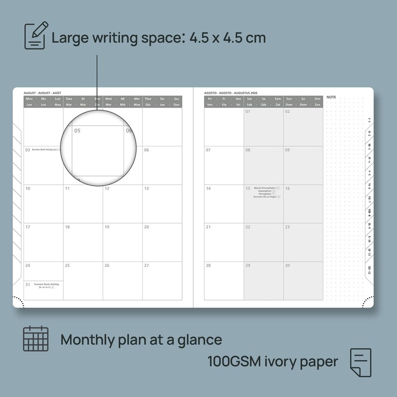 - Weekly plan/monthly plan: 1 week 2 page weekly calendar provides a complete and clear weekly overview (from Monday to Sunday). Each monthly plan includes a monthly overview and a notes section.