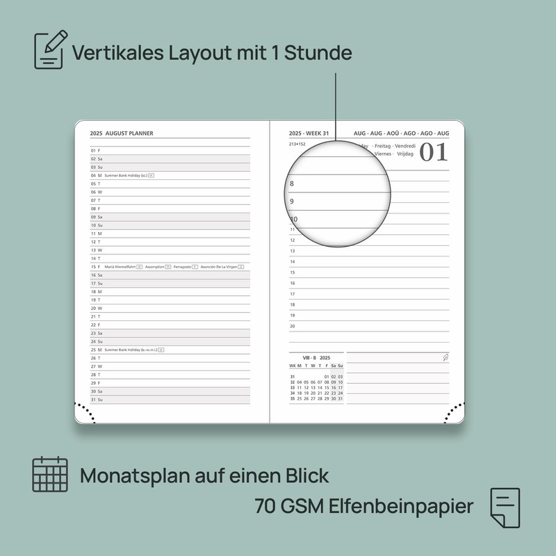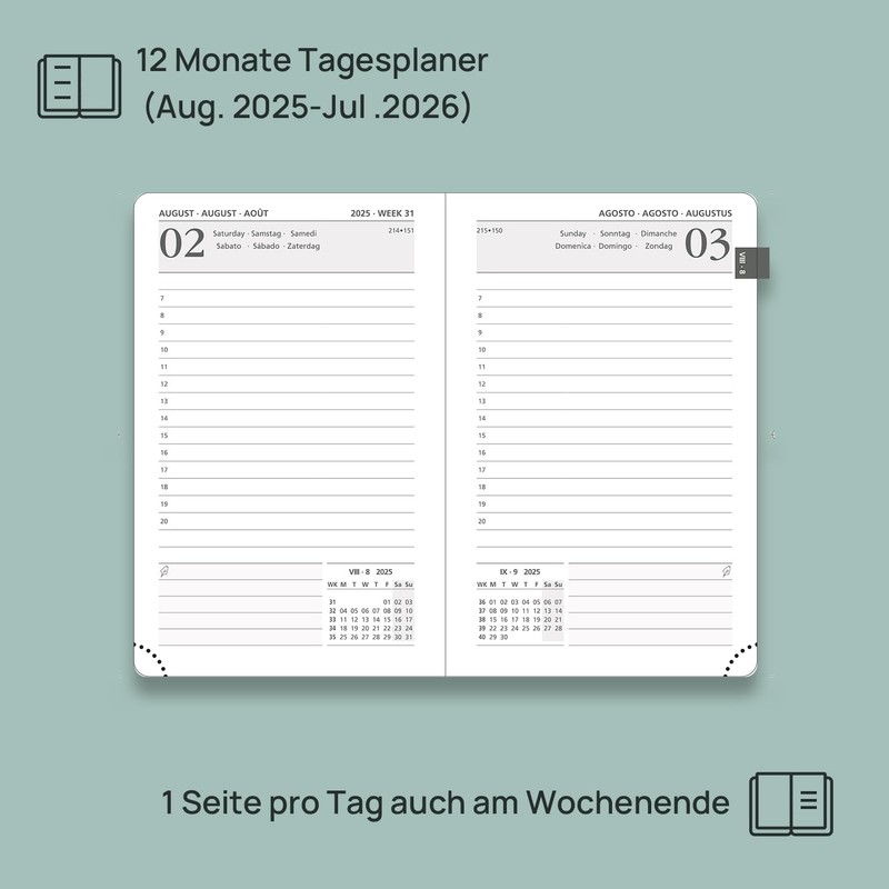 • 1 PAGE PER DAY FOR 365 DAYS: This POPORUN daily planner (Aug.2025-Jul.2026) offers spacious daily planning with hourly plans for your appointments that organize your busy daily routine (from 08:00 to 20:00).