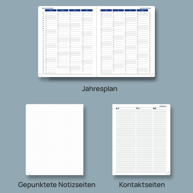 • Extra pages – This weekly planner 2026 also contains an annual overview page 2026-2027 + a holiday and calendar page 2026-2027 + 2 contact pages + 1 password page + 7 dotted note pages on which you can write down your ideas, thoughts or other happy things in detail.