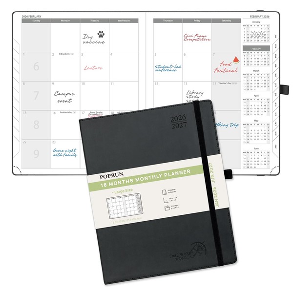 POPRUN Monthly Planner 2026-2027(Large- 8.5'' x 10.5'' Soft Cover), 18-Month Calendar Planner (January 2026-June 2027), Agenda 2026 with Monthly Tabs & Calendar, 100 GSM Paper - Black