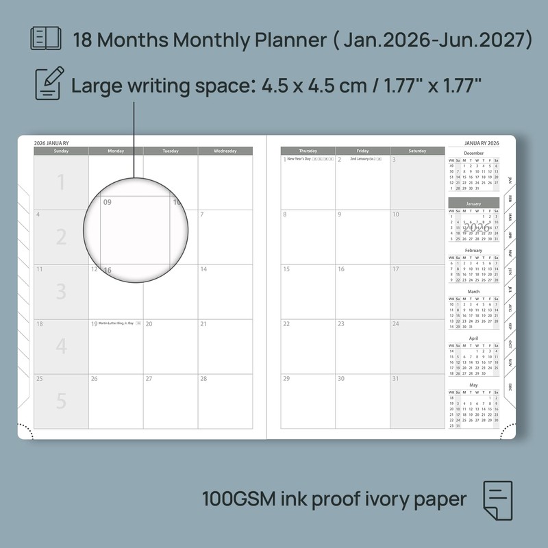 - 18-MONTH MONTHLY CALENDAR: Featuring pages from January 2025-June 2026 with week numbers and holidays marked, this planner is perfect for long-term planning. Each month covers a 2-page spread with dotted notes and an expense tracker to help you manage deadlines and goals efficiently.