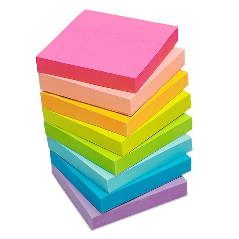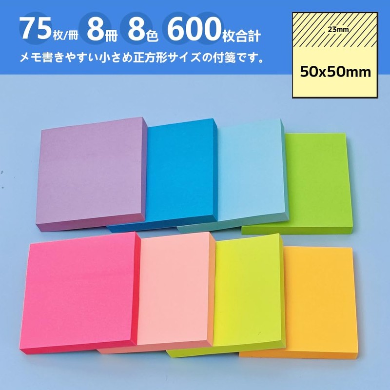 - 600 sheets of sticky note set. Package Includes: 8 x Sticky Notes (75 sheets/book) Color: Neon Color(Purple, Blue, Light Blue, Green, Yellow, Orange, Pink, Rose Red) Size: 50mm (Width) x 50mm (Length) Material: 80gsm Paper Small Square Size Sticky Notes for Easy Notes
