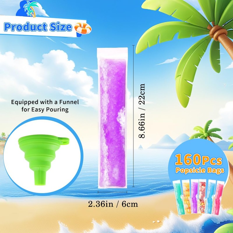 - The Packaging Includes: Each pack contains 160 pcs popsicle bags and a silicone funnel, with sufficient quantity. Each popsicle bag measures 8.66 x 2.36 inches (22 x 6 cm). Our disposable popsicle bags are the perfect tool for making popsicles, fruit smoothies, yogurt, and other frozen foods