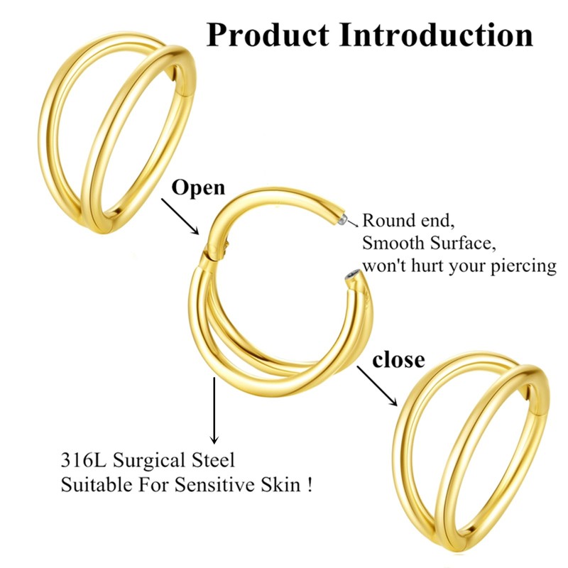 - Features two tires that connect at the top to form a single (double) hoop ring. Double action in just one piercing. Very easy to put on and super comfortable. Ring gauge options: 16 gauge (1.2mm), 18 gauge (1.0mm). Inner diameter: 6mm, 7mm, 8mm, 9mm, 10mm, 12mm. Color Options: Silver, Gold, Black, Rose Gold