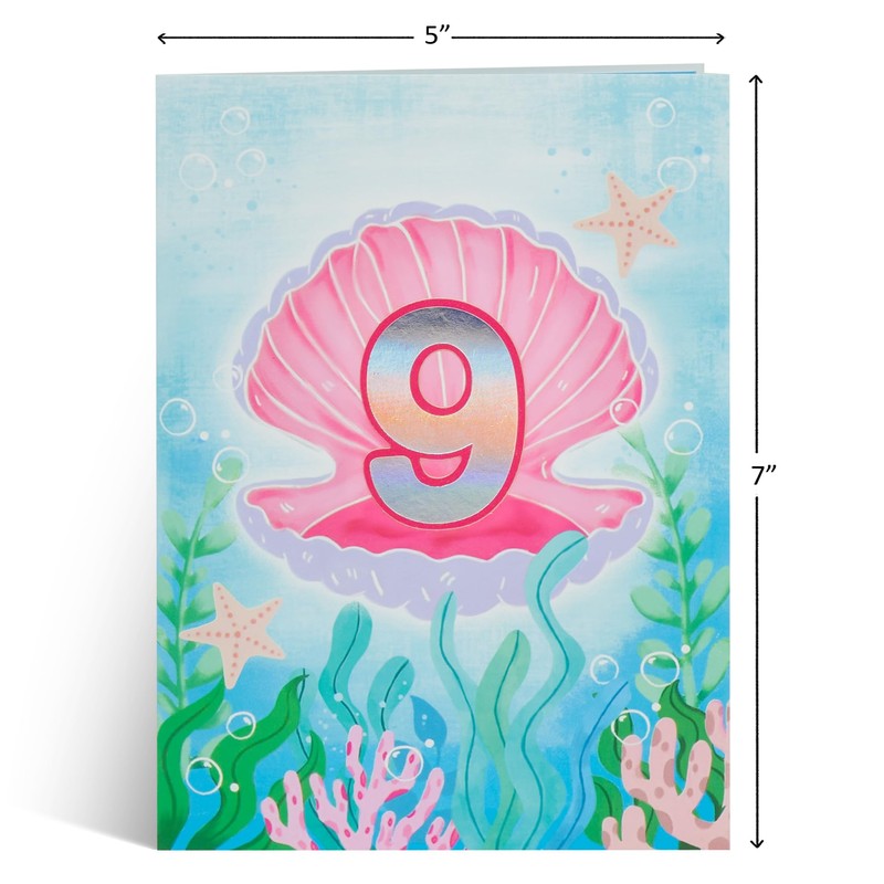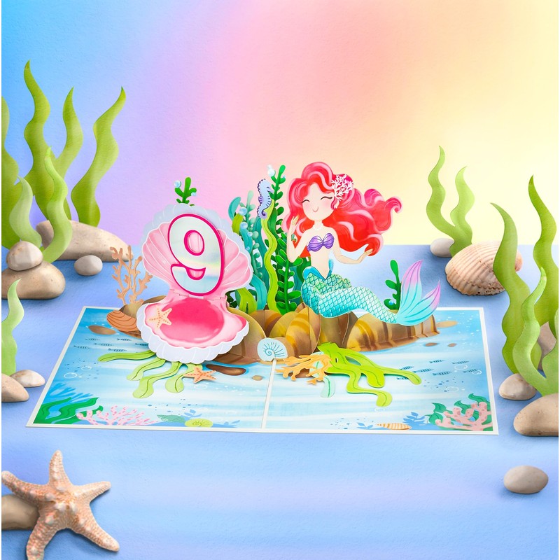 POPWOW Happy 9th Birthday Pop Up Card, Mermaid, Pearl Shell, Ocean, 3D Greeting Card, Gifts for Girls, Daughter, Granddaughter, Niece, 5x7 - Includes Envelope And Message Note