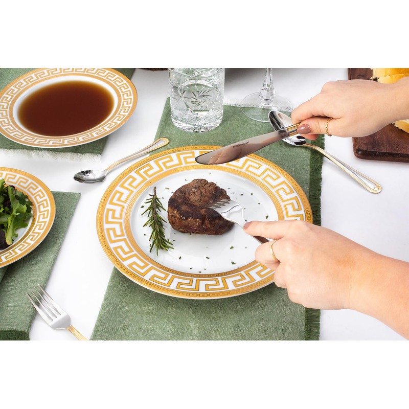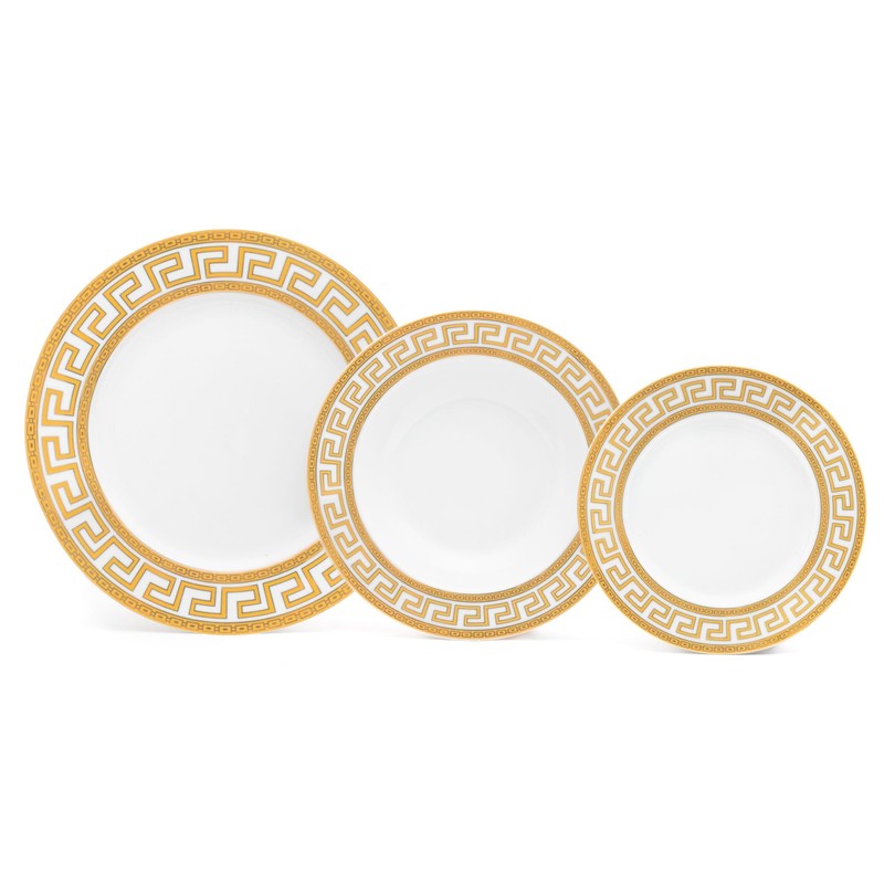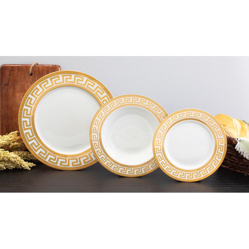 - Stunning Greek Key Design - Add a touch of luxury to your dining table with our 12 piece porcelain dinnerware set. Featuring an elegant gold Greek key design on the edge, this set brings timeless sophistication to any meal.