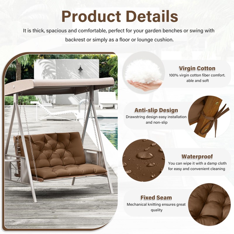 - 🍰 Non-Slip Design - Swing cushions for outdoor furniture come with 6 pairs of 11.8-inch anti-slip straps, ensuring they stay in place on your garden furniture, and won't slide or blow away, providing a safe and stable seating experience. The stitched central point design is not only fashionable and beautiful but also can prevent the filling from shifting. Whether you're sitting for a short break or a long leisurely swing, you don't have to worry about the waterproof bench cushion moving around.