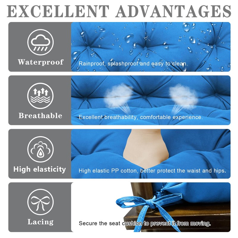 - Porch Swing Cushions Material: This outdoor swing Cushions cushions is made of high rebound material and 99% waterproof polyester fabric, which is very soft, breathable, moisture-proof, durable, and has excellent elastic support and recovery capabilities. can relieve pain in the hip back and sciatic nerve. This porch swing cushion makes sitting for long periods of time more comfortable and enjoyable.