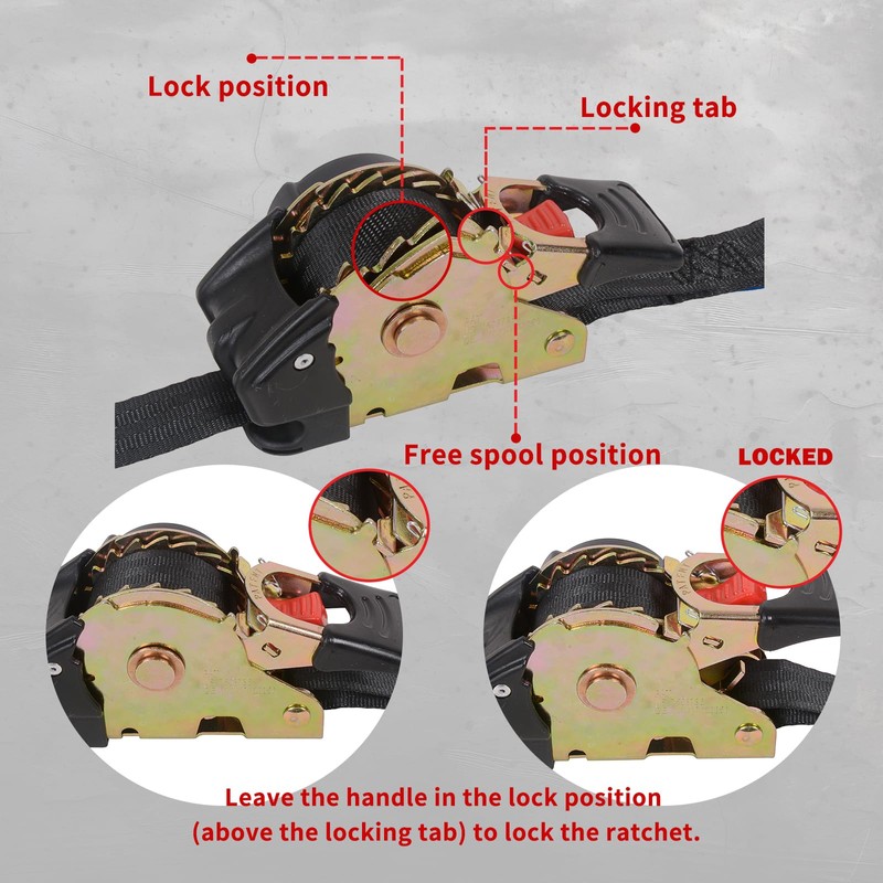 - 【Secure Locking】 Rest assured that your cargo will remain securely fastened during transportation. After releasing the tie down strap, hold the red button and lift the black handle. Pull the handle back and forth to tighten the straps to the desired tension. Keep the handle lifted to lock the straps in place securely. (Note: Do not reset the black handle after locking, as it will loosen the strap.)