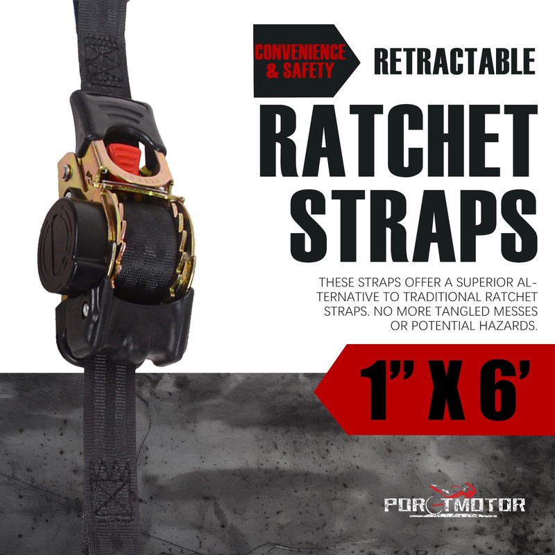 Porotmotor 2 Pack Retractable Ratchet Straps (1" x 6'), 1500LBS Break Strength Ratchet Tie Down Straps with Double J-Hooks Auto Retracting Ratchet Straps for Motorcycle, Trailers, Boats, ATVs, UTVs