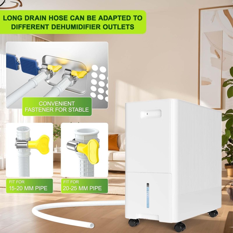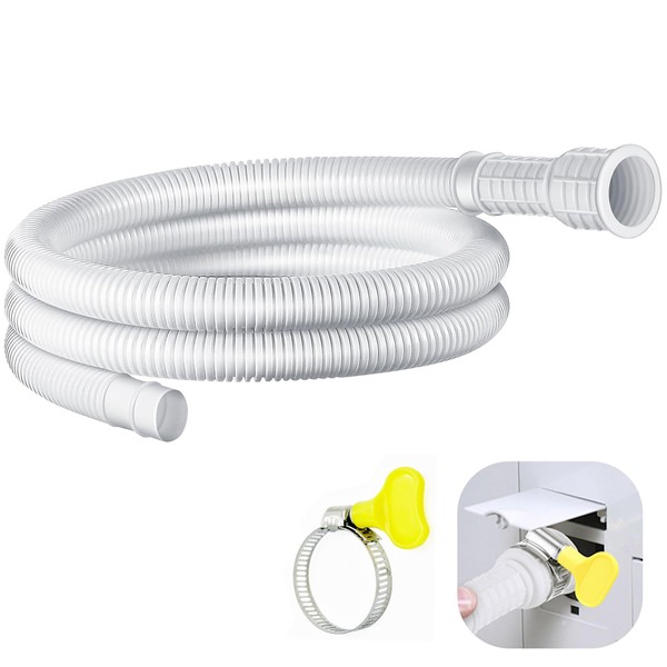 Designed to fit most standard models, the hose features a cuttable rubber adapter and a secure connect clamp, offering a leak-proof and stable fit. The sleek white design complements any appliance, blending seamlessly into your space. Whether you're removing excess moisture from your living area or enhancing your appliance's efficiency, this durable and versatile drain hose is the perfect solution.