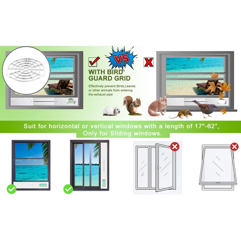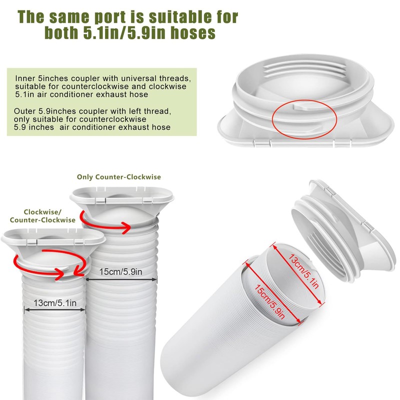 - 【Dual-Function Connector】Our latest AC window kit includes an innovative 2-in-1 connector: Inner flange: Fits 5.1" vent hoses (clockwise/counter-clockwise rotation) Outer flange: Compatible with 5.9" exhaust hoses (counter-clockwise/clockwise rotation)