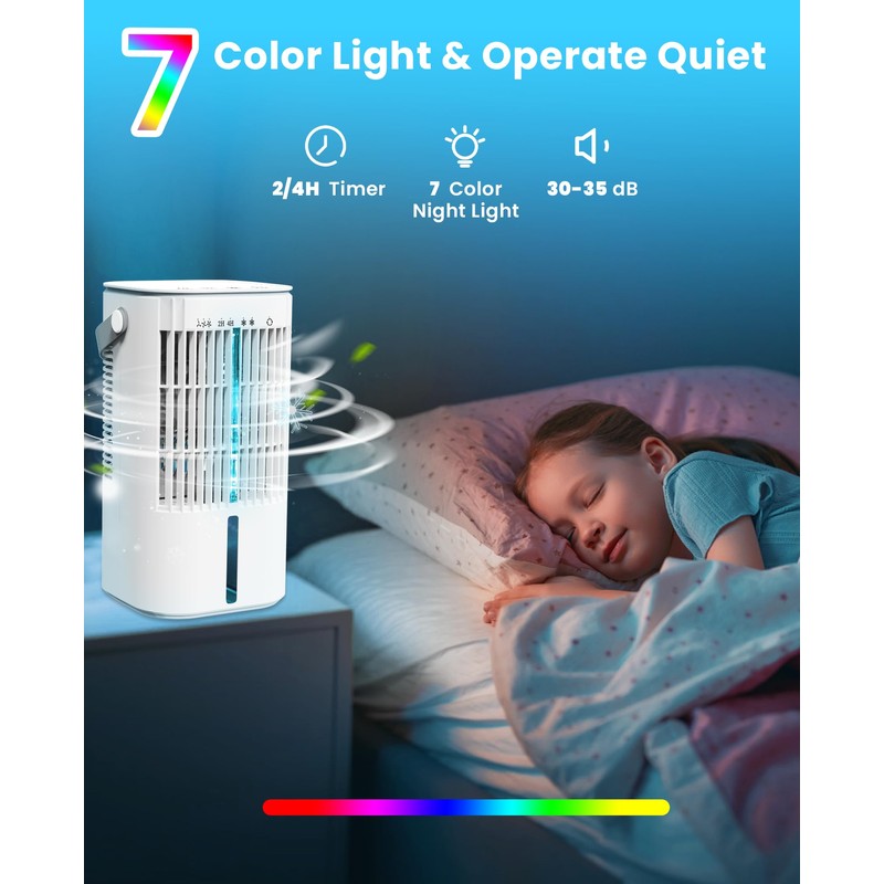 - ❄️7 LED Lights & 2-4 Hour Timer&Quite Operation❄️: Evaporative Air Cooler has 2 kinds of smart timer (2H/4H) to suit your needs.7-color night light automatically changes, create the perfect ambiance . The noise of air cooler is less than 35dB even when a strong wind speed is provided. At work and rest, this is a good friend who is quiet and comfortable for you.