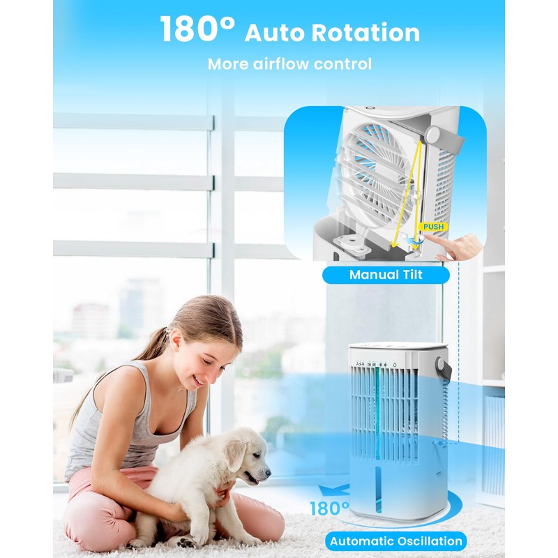 - ❄️Auto Rotating Mode❄️: Air cooler comes with a 180°auto rotating mode which ensures even distribution of cold air throughout the room, allowing you and your friends to enjoy a consistently cool environment. Suitable for various occasion,such as homes, kitchens, bedrooms, dormitories, desks, offices, garages, and camping trips.