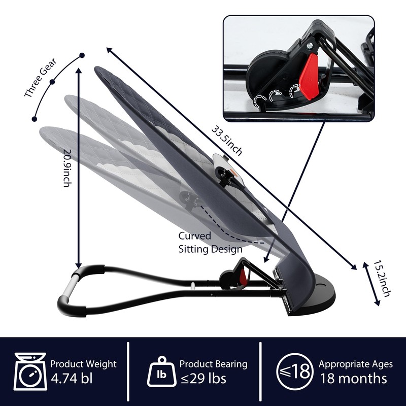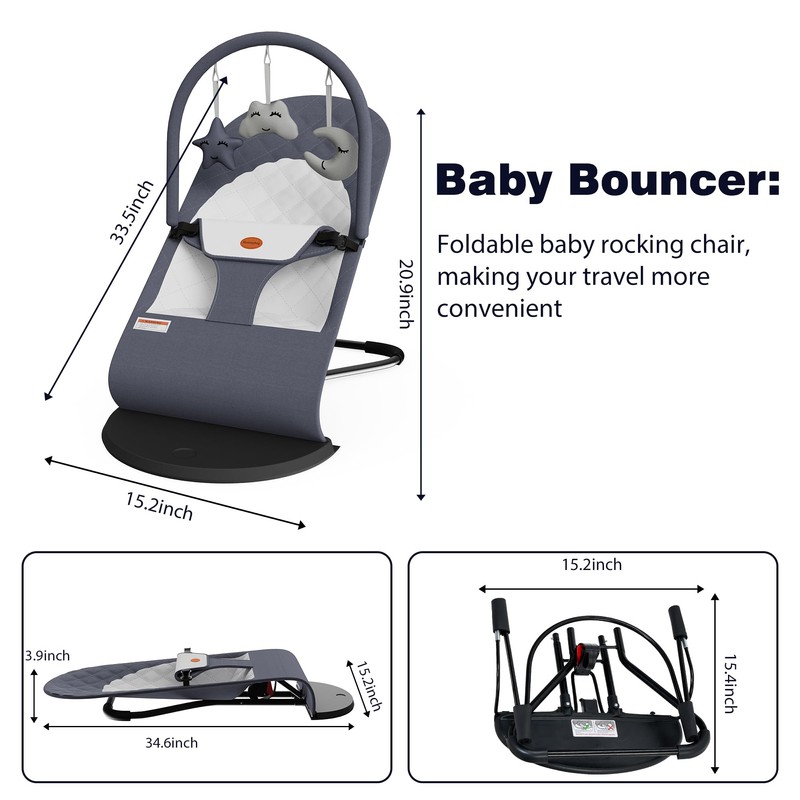 Portable Baby Bouncer Seat for Infants, 0-18 Months, 3 Modes of Use with Rocker & Stationary Options, Ergonomic Infant Chair with Hanging Toys, Baby Shower Gifts – Grey