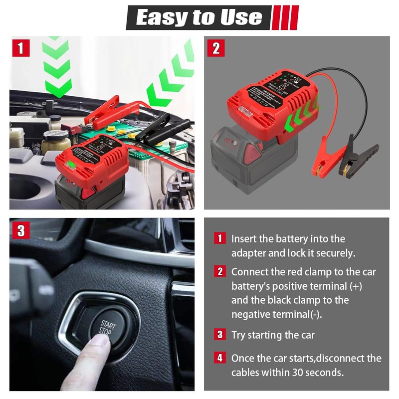 - 【Easy to Operation】To use Jump Starter, first plug jumper cable adapter into your Milwauke 18V battery tightly, then attach the red battery clamp to the vehicle’s positive terminal (+) and the black clamp to the negative terminal (-). Next, Start the car and then remove the clamps. For milwaukee jump starter