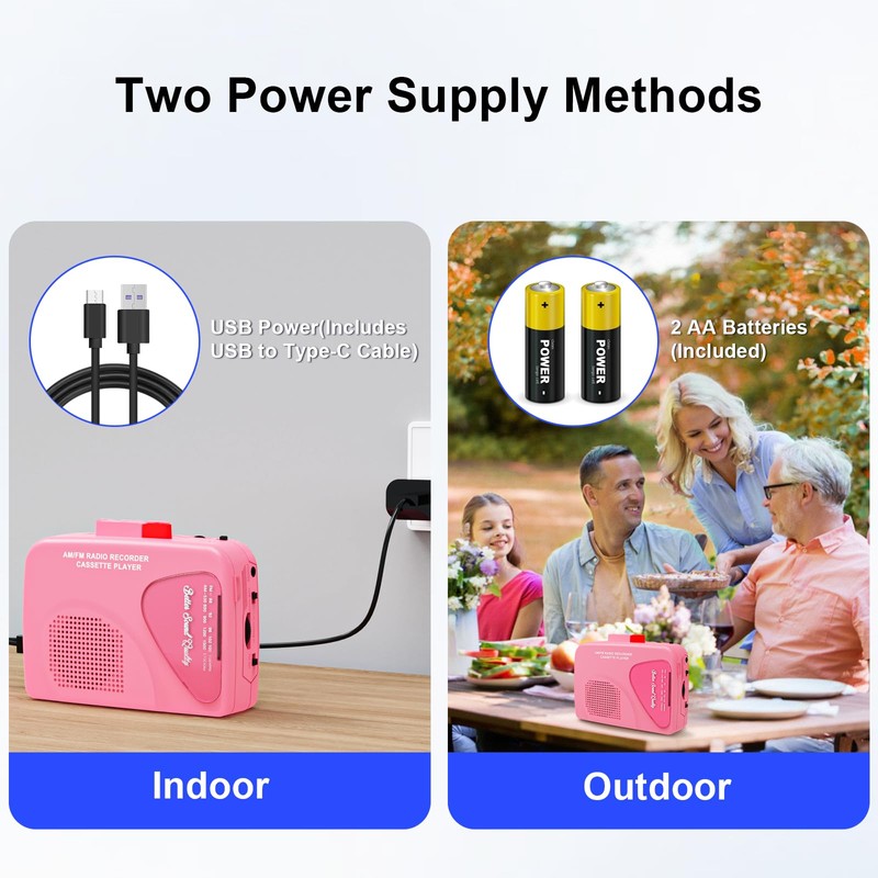 • 🎧 Portable and Travel-friendly - Compact design with a sturdy belt clip for easy carry, perfect for outdoor use, travel. The tape player is powered by 2 AA batteries (included) or USB cable for continuous playback.