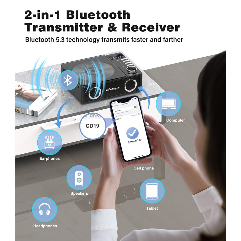 - 【Bluetooth 5.3 Technology for Faster Connections and Reads】With the cd player bluetooth receiver, the bluetooth cd player can connect to your phone, tablet, and computer. The CD player with bluetooth transmitter, you can stream sound to wireless headphones, earphones, and bluetooth speakers.