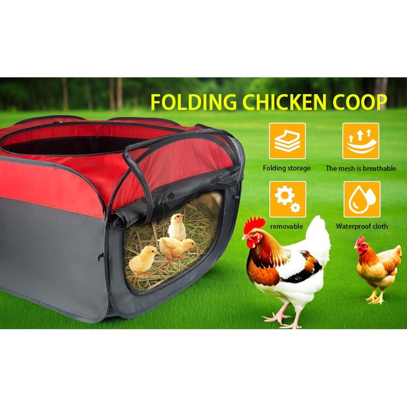 Introducing the ultimate brooder box kit designed for raising chicks, ducks, quail, and other small poultry. This portable enclosure comfortably accommodates up to 15 chicks, making it perfect for both beginners and experienced poultry keepers. The waterproof construction features a durable red and black design with mesh ventilation panels for optimal airflow. A standout feature is the removable liner that makes cleaning quick and hassle-free - simply take it out and wipe clean. The kit comes complete with everything you need: the main brooder box, a convenient storage bag for transport or off-season storage, ground stakes for stability, a black pad for comfort, and a protective cover. The quick-drying material ensures your little ones stay dry and comfortable. Perfect for both indoor and outdoor use, this brooder box sets up in minutes and collapses flat when not in use. The mesh windows allow you to monitor your chicks while providing essential ventilation. Whether you're starting your first flock or expanding your existing one, this comprehensive kit provides everything needed for successful chick rearing.