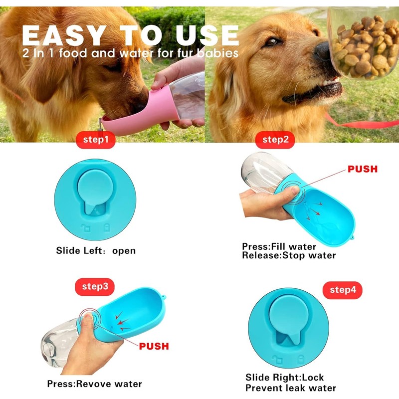 - 【Innovative Integrated Design】 : 2 in 1 dog water bottle that ingeniously combines a food/treat container and water dispenser. It’s a true lifesaver for anyone who loves to take their pets on adventures. The water dispenser is compact and incredibly easy to handle, making hydration on the go simple and mess-free.
