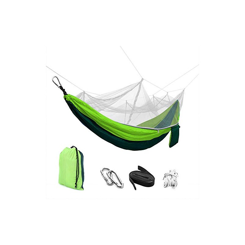 Portable Double Person Travel Camping Hammock Sleep Swing Bed with Mosquito net & Hammock Tree Straps, Parachute Nylon Hammock for Backpacking Travel (Light Green&Deep Green)