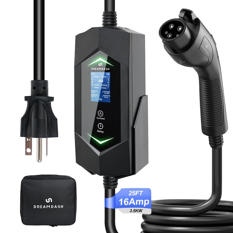 1.Versatile Charging Solution The DREAMDASH Portable EV Charger offers unmatched flexibility with its 25-foot heavy-duty cable, allowing you to charge comfortably in garages, driveways, or remote locations. Its 3.5kW maximum power output ensures rapid and efficient charging for all J1772 compatible electric vehicles.