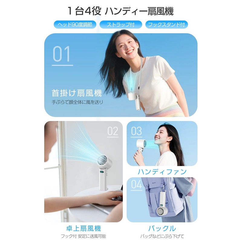 - The fan head can be adjusted 90°, so you can freely blow the wind at any angle as you like when using it as a tabletop or neck fan. It also comes with 7 blades that are specially designed for wind paths to blow out cooler