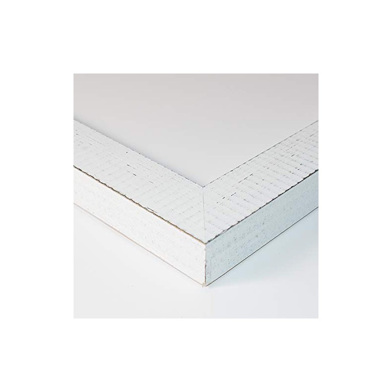 This Frame is not plastic, not fiberboard, not artificial wood, but real Wood. It is made from solid Wood with White paint that has a distressed look throughout. It features a 1" width and is 0.7" tall off the wall.