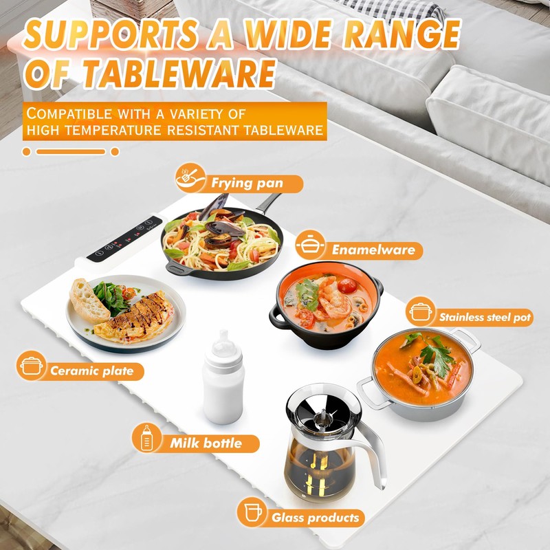 - High Quality Nano-Silicone Material: Crafted from top-tier flexible silicone nano material, our electric warming tray offers durability, splash-proof protection, stain resistance, and oil resistance. Fold and store without worrying about unsightly creases, ensuring lasting quality.