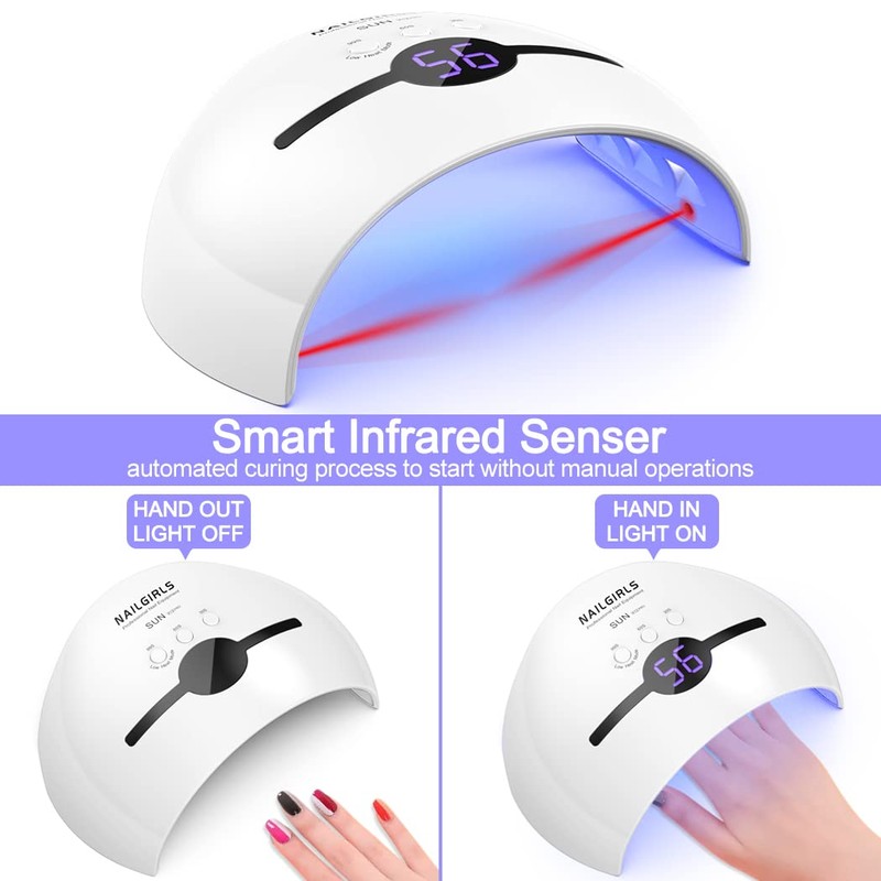 - 【Safe and Comfortable】:Combine the best of both a UV nail lamp and LED lamps. Comes with the painless soft nail light that eliminates your fear of hurting your hands, This gel lamp can protect hands and eyes from damage caused by prolonged exposure and also protects your skin from getting darker. NAILGIRLS nail light takes your manicure and pedicure experience to a whole new level.