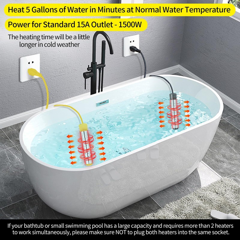 - Fast Heating, 1500W high power fast immersion water heater can heat 5 gallons of ROOM TEMPERATURE WATER in minutes, saving energy and money. If you want to heat up for a shorter time, you can use 2 water heaters at the same time, but be careful NOT to use them on the SAME OUTLET. The heating time will be little longer in cold weather. We recommend a maximum use time of 3 hours. And this immersion heater is ONLY for WATER HEATING.