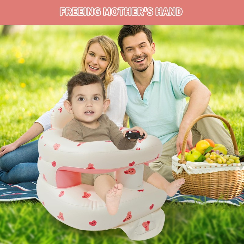 Quick Inflation & Easy Use: This baby chair inflates in minutes using a hand pump or by mouth, with an anti-leak valve to keep it firm. Deflation is just as simple—press the valve to release the air, and the chair folds compactly for easy storage or travel.