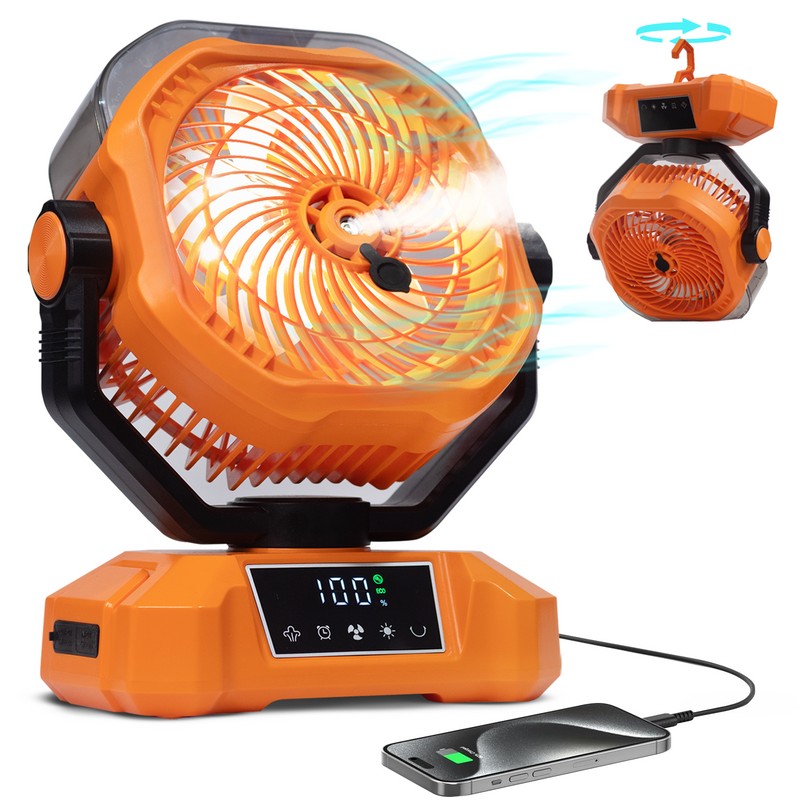 • Portable & Rechargeable Stand & Hanging Fan : This camping fan is a versatile cooling solution designed for convenience. Its cordless design allows for easy placement anywhere without the need for a power outlet. With its compact build, it can stand on floors or tables or be hung using the included hook, making it ideal for indoor and outdoor use, such as tent or car camping. Whether indoors or on the go, this fan provides powerful yet quiet cooling for maximum comfort.