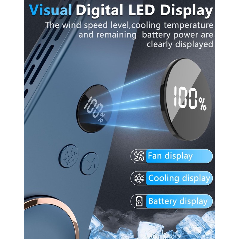 - 🍨【LED Display&User Friendly Ac Neck Fan】Bladeless portable neck air conditioner with visual LED display, allowing you to check cooling modes, fan speeds, and remaining battery power at any time. No need to worry about neck cooling fan air conditioner's battery unexpectedly running out and affecting usage. The fan speeds and cooling functions of neck cooling fan are controlled by 2 separate buttons. Whether you need a soft breeze or powerful cooling, simply press the buttons to adjust