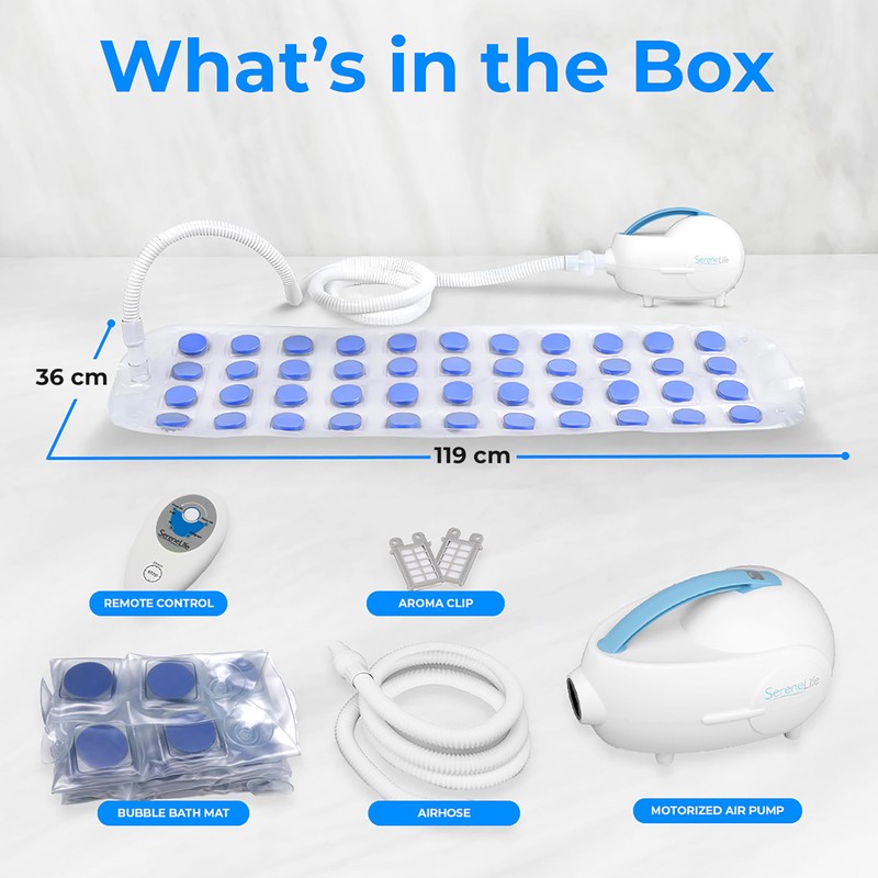 The Serene Life Bubble Bath Massage Mat will bring spa day to your tub! The external air pump is designed to sit beside your bath tub, while the air hose delivers soothing bubbles to help you relax. The fully submergible bath mat is completely waterproof and features a suction cup bottom for non-slip comfort. The cushioned & padded surface texture of the mat helps melt the stress away as you control the bubble-flow intensity. Simply drop the mat in the tub & relax with the Serene Life Bubble Bath Tub Massage Mat.
