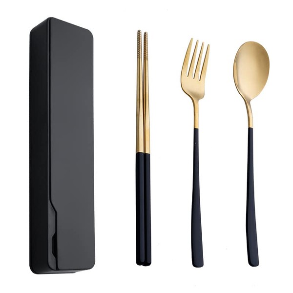 Portable Stainless Steel Flatware Set, Travel Camping Cutlery Set, Portable Utensil Travel Silverware Dinnerware Set with Cover- Spoon, Fork, Chopstick- Golden (Gold)