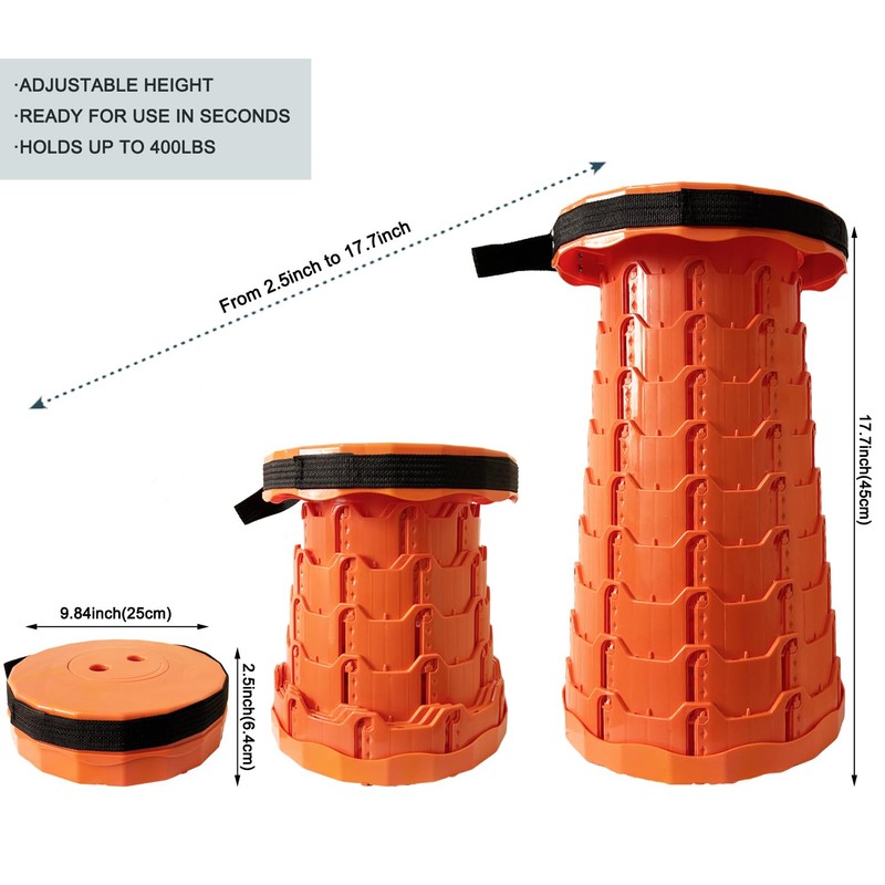 - Foldable,Adjustable Height Retractable - The folding Camping stool to open and close easily in just seconds,lock in place with slight rotation, easy installation. The height can be adjusted freely between approximately 2.56 inch and 17.7 inch,you can adjust it to the most comfortable height.It applicable for adults and children,it is perfect for sending as a gift for family,friends,relatives.So that telescopic stool is suitable for all ages