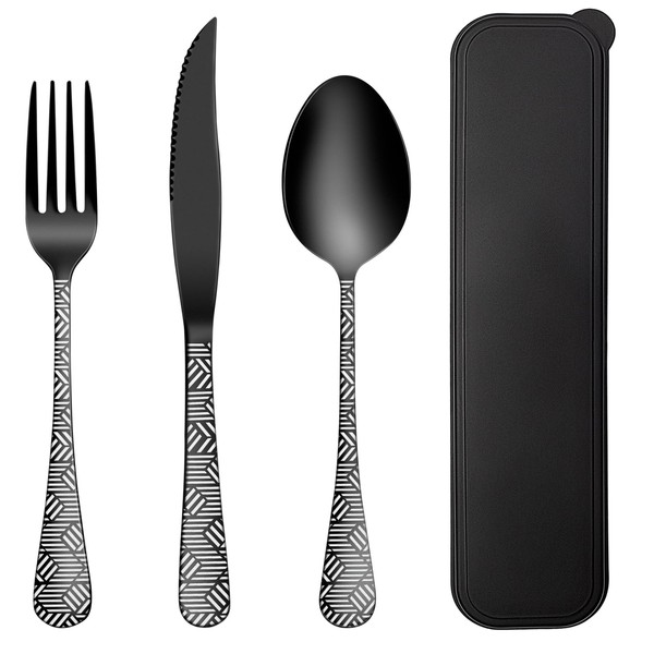 Portable Travel Silverware Set with Case 18/8 Stainless Steel Flatware Sets Include Knife Fork and Spoon with Case Reusable Utensil Set for Lunch Box(Black)