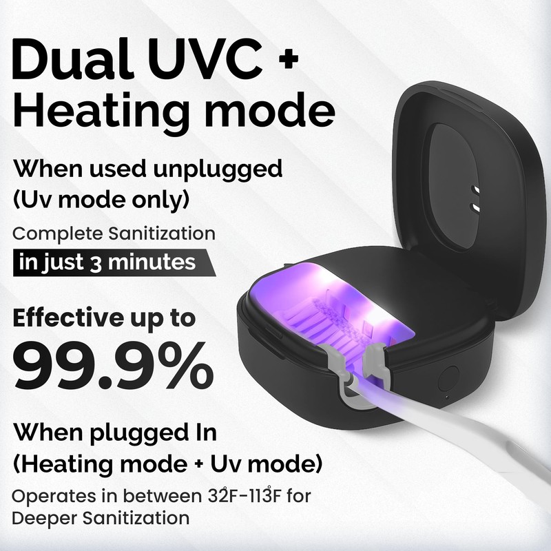 - Dual Disinfection Modes: Choose between a standard 3-minute UV mode or extended 120-minute UV + heating cycle when connected via USB Type-C power. Automatically switches back to UV-only mode if unplugged, ensuring flexibility for bathroom or travel use.