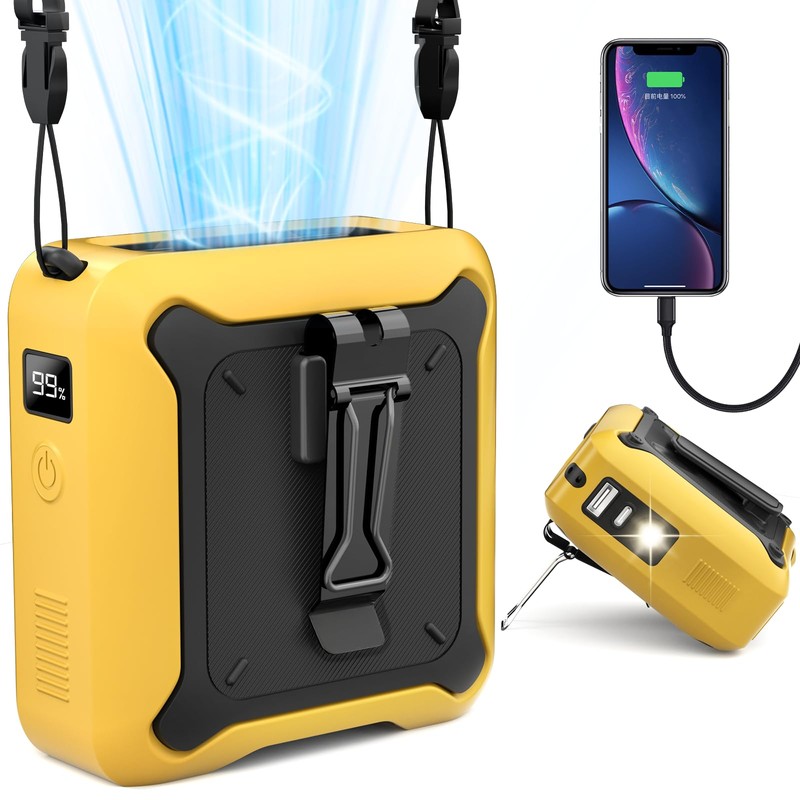 Portable Waist Fan Clip on Belt Under Shirt w/LED Display & Flashlight, 8000mAh Battery Powered, Rechargeable 5-Speed 14600RPM Personal Cooling Fan for Construction, Warehouse, Outdoor Jobsite,Yellow